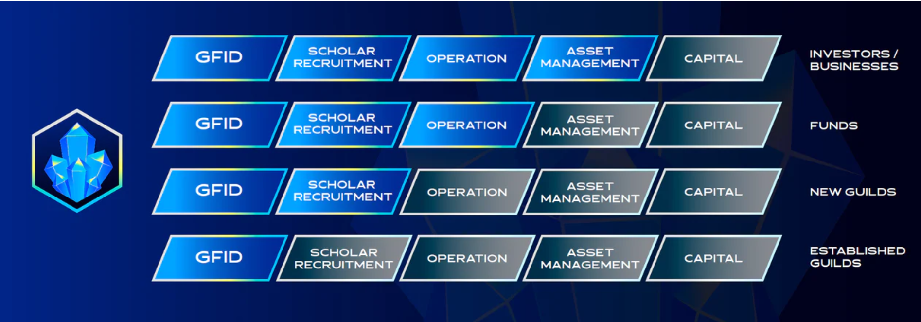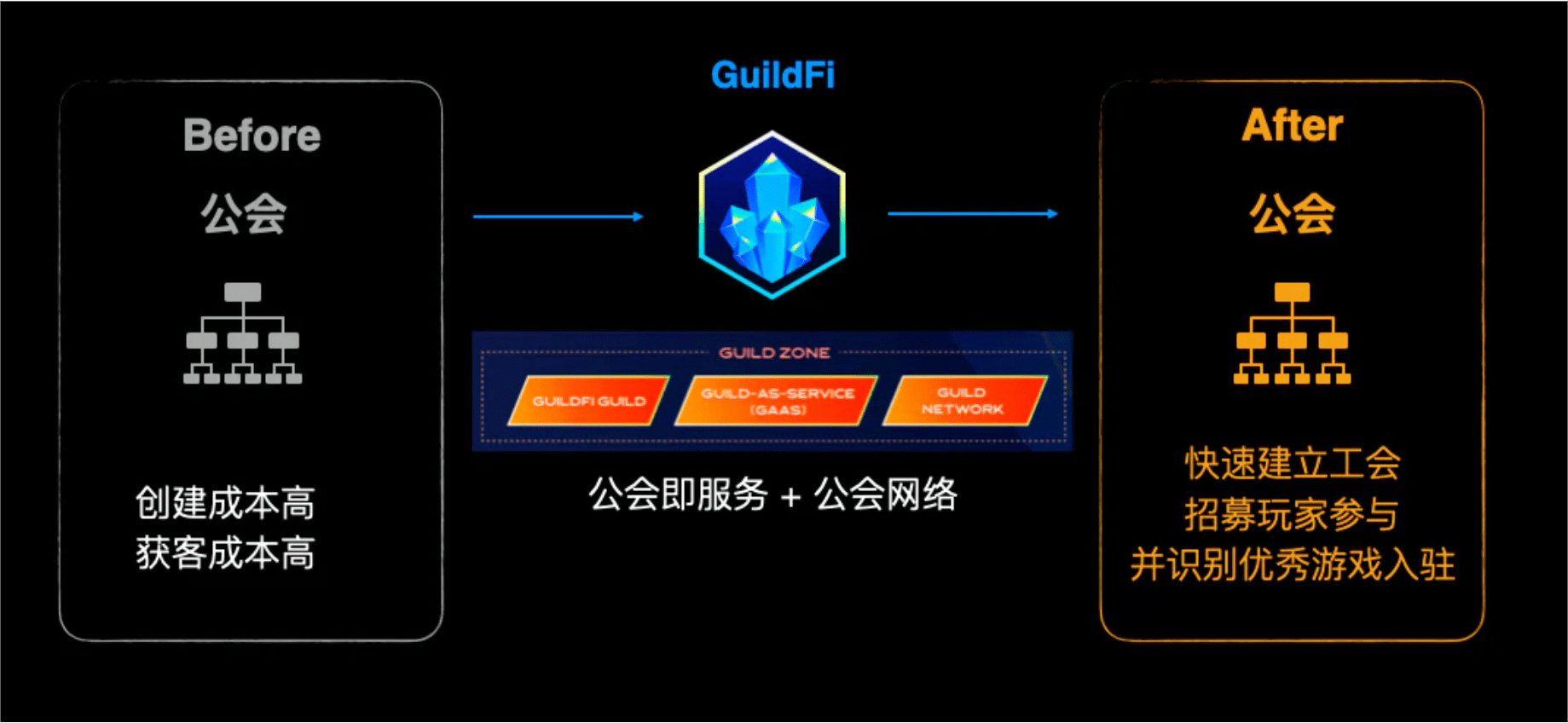 即由GuildFi提供各种公会所需要的模块,如创建ID、注资、运营、资产管理等,