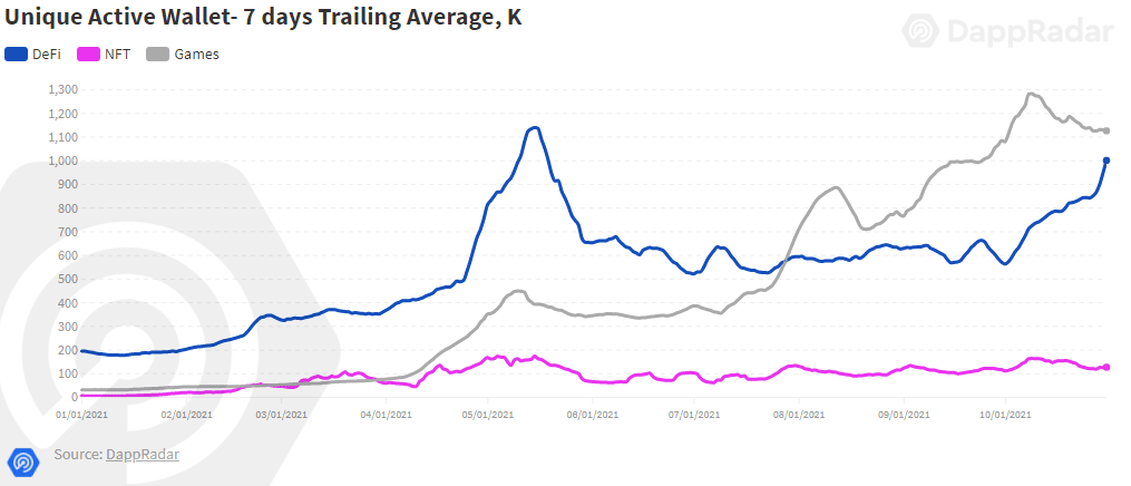 10月份平均每天有超过100万个独立的活跃钱包地址连接到链游app中,