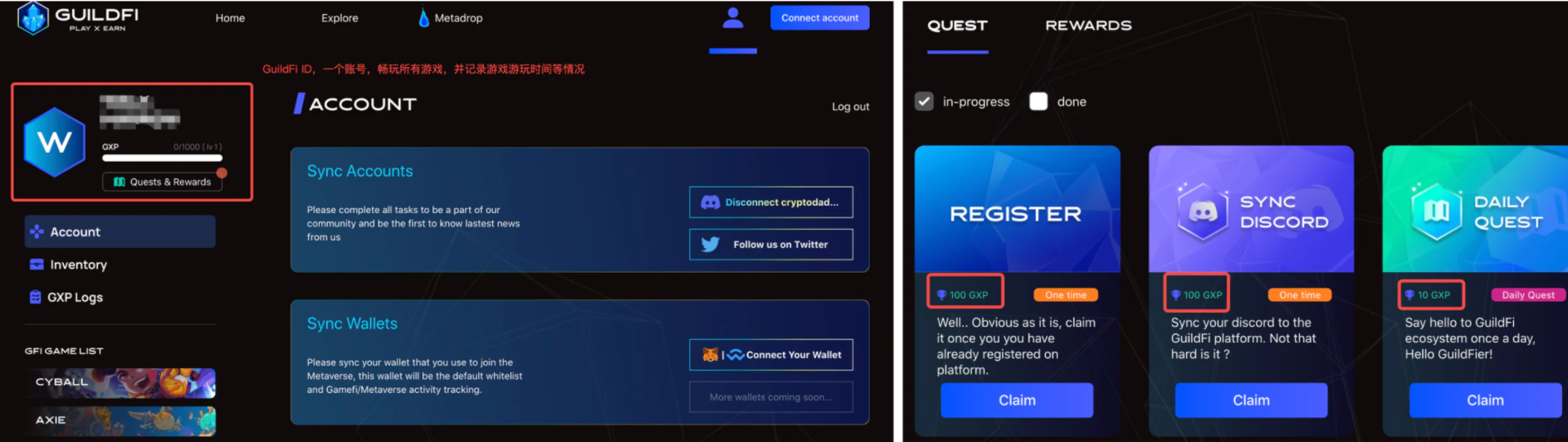 并设计一系列的任务让你达成,成功后可以获得GXP(GuildFi的游戏经验值系统),